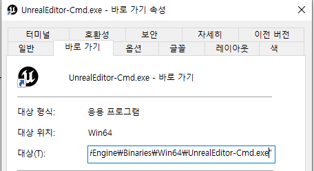 UnrealEditor-Cmd.exe 속성 - 대상 뒤에 다음과 같이 넣어준다.