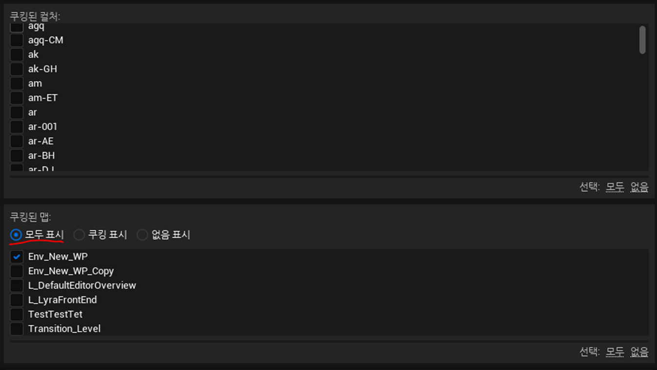 (모두 표시)가 선택되었는지 확인 후 PSO캐시를 수집하기 위해 실행할 때 필요한 Level (레벨)을 체크한다.