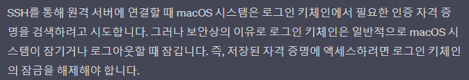 → ssh 로 접근 시 매번 키체인의 권한을 흭득하는 처리를 해야 함