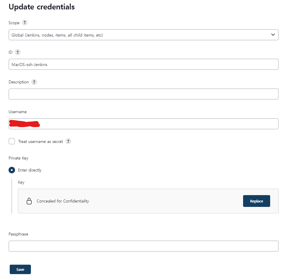 그리고 Credentials 하나를 만들어 Private key 에 클라이언트에서 만들 개인키 (id_rsa)를 복붙한다.